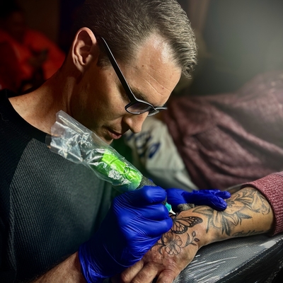 Hey I’m Chris, I’ve been tattooing professionally over 10 years. Tattooing has always fascinated me and I’ve been fortunate in my career to work with many gifted artists across the country from my apprenticeship with Mojo in Ogden Utah to Columbia sc to Tucson Az. I strive to provide safe high quality clean tattoos. I particularly enjoy doing high contrast, geometric anything, illustrative, and some more uncommon styles such as various blackout designs, abstract, dot work/pointillism. Traditional American and neo traditional are always fun too! I look forward to creating your next tattoo!